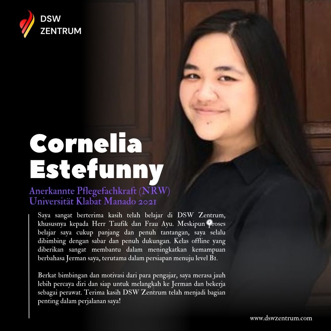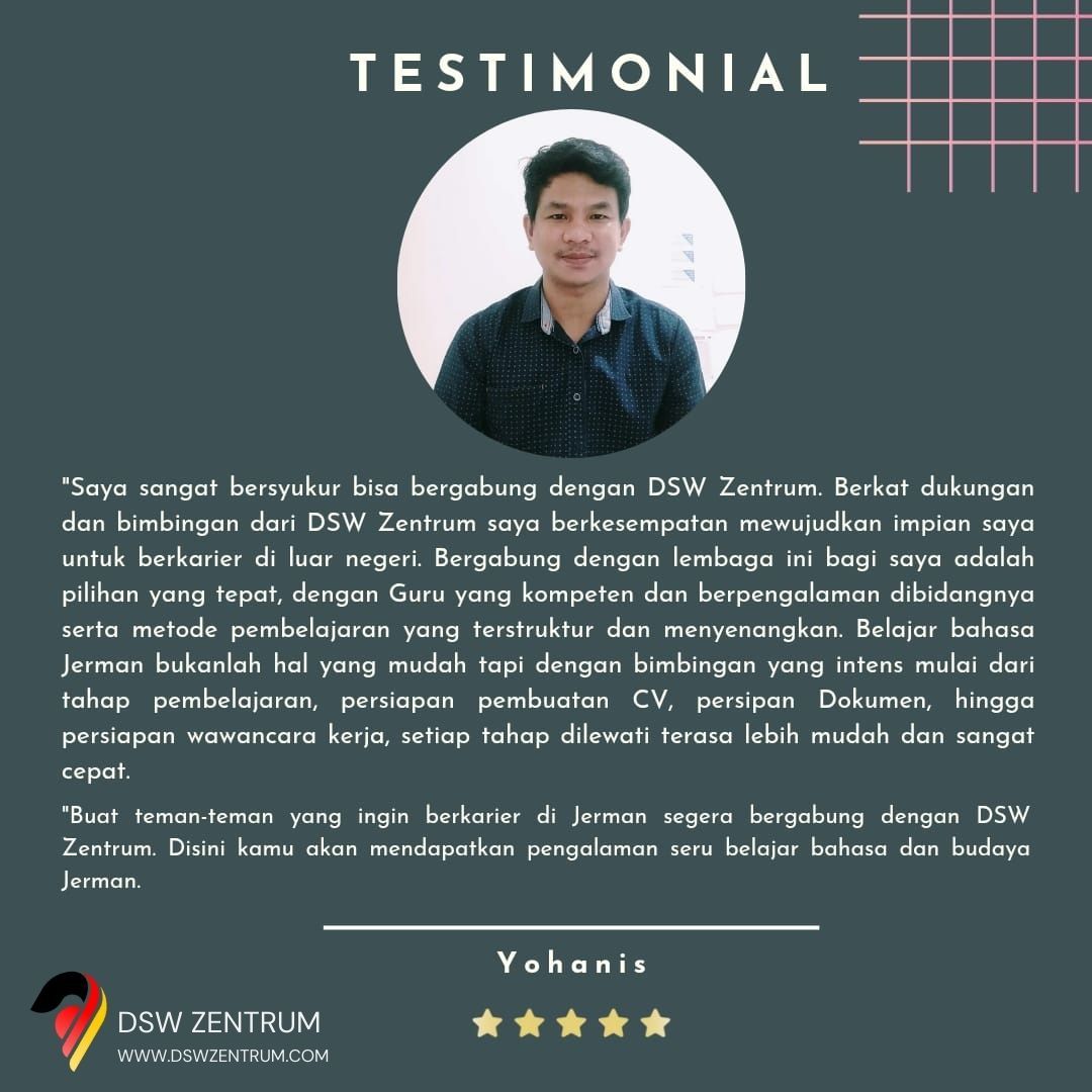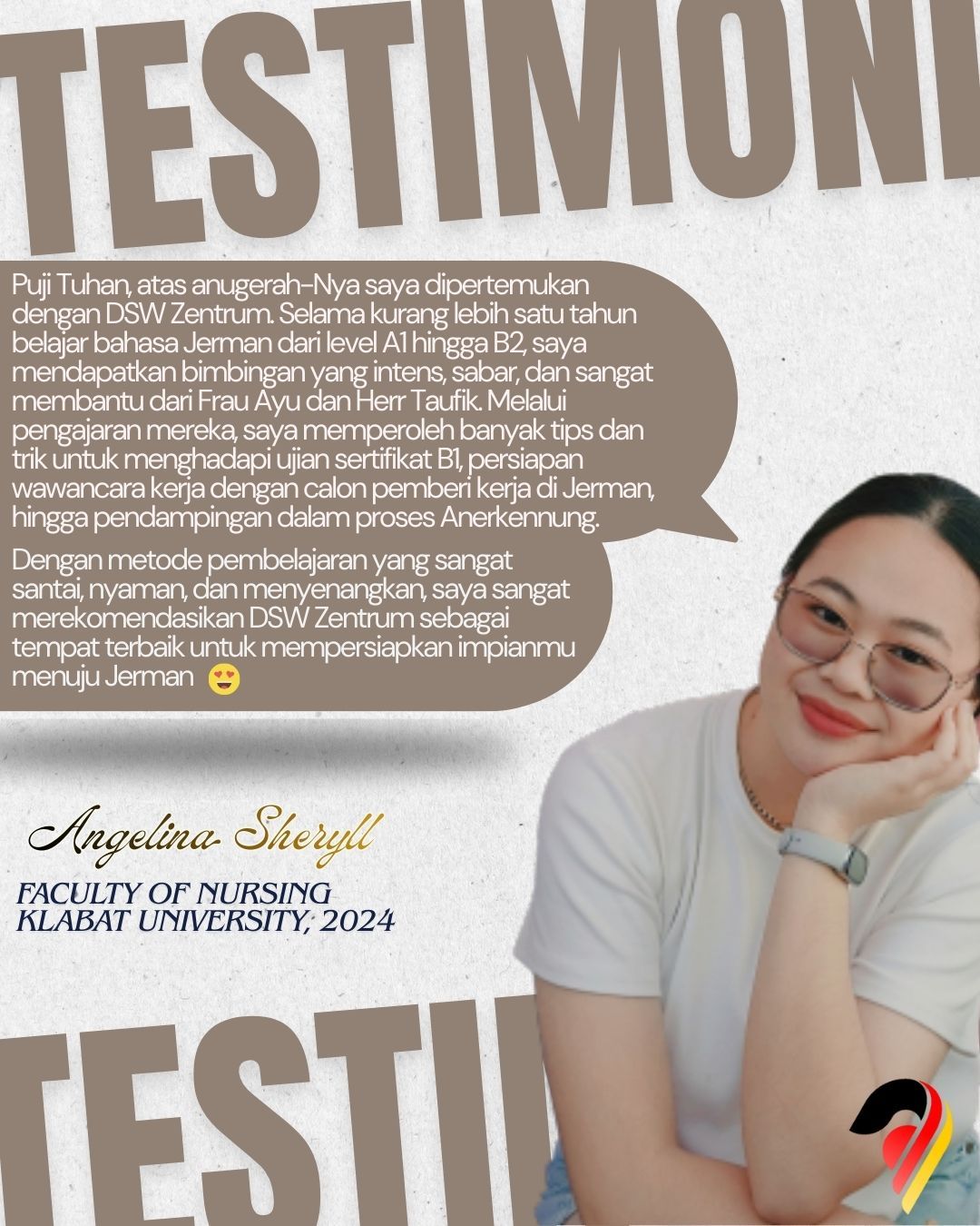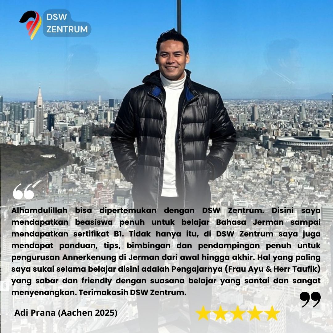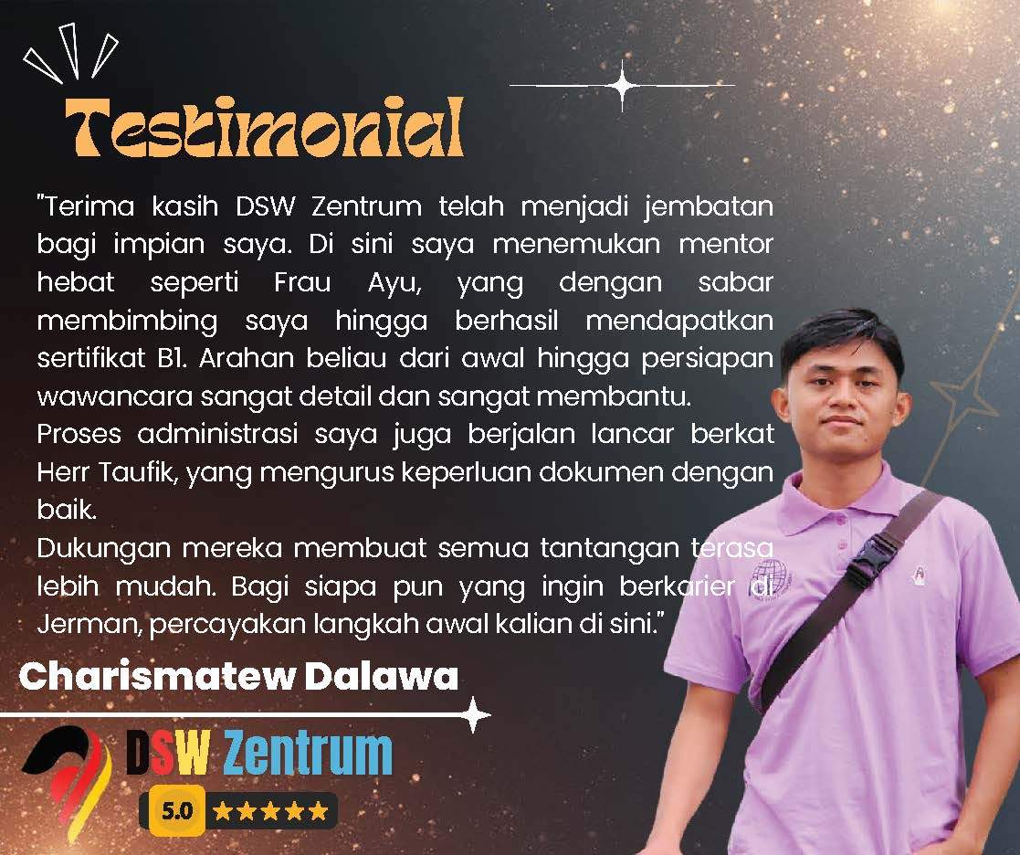 Saya sangat berterima kasih telah belajar di DSW Zentrum, khususnya kepada Herr Taufik dan Frau Ayu. Meskipun proses belajar saya cukup panjang dan penuh tantangan, saya selalu dibimbing dengan sabar dan penuh dukungan. Kelas offline yang diberikan sangat membantu dalam meningkatkan kemampuan berbahasa Jerman saya, terutama dalam persiapan menuju level B1.