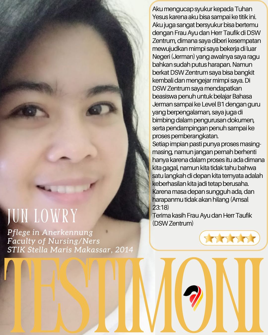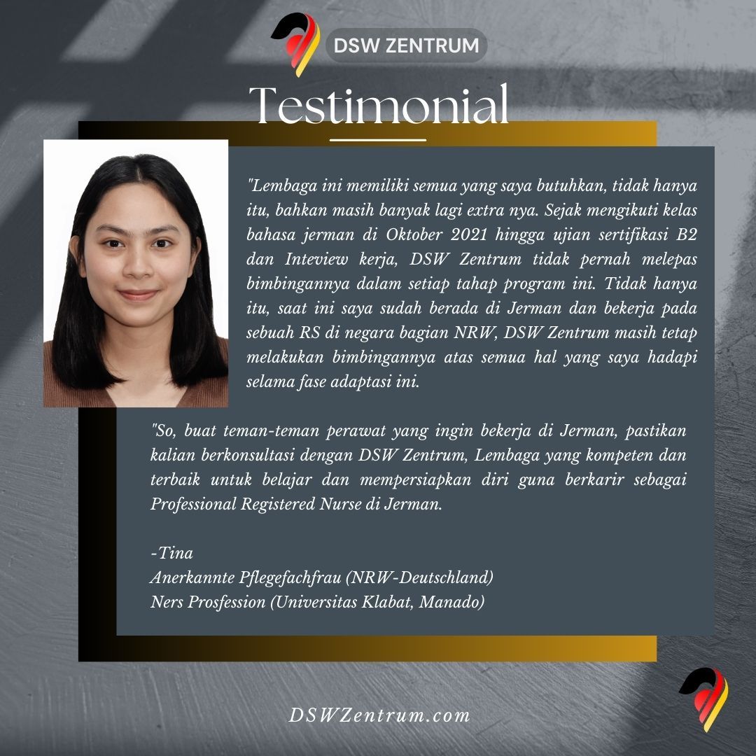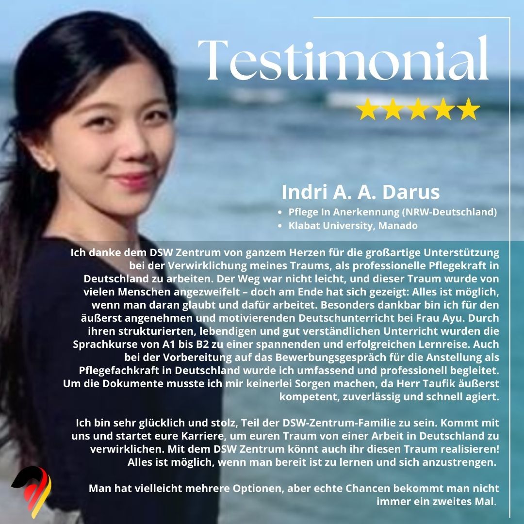 Dengan bantuan DSW Zentrum khususnya Frau Ayu dan Herr Taufik yang telah banyak membantu, akhirnya aku bisa menggapai impian aku untuk menjadi seorang perawat di luar negeri. Yang awalnya cuma angan-angan sekarang bisa jadi kenyataan. Herzlichen Dank DSW Zentrum.
