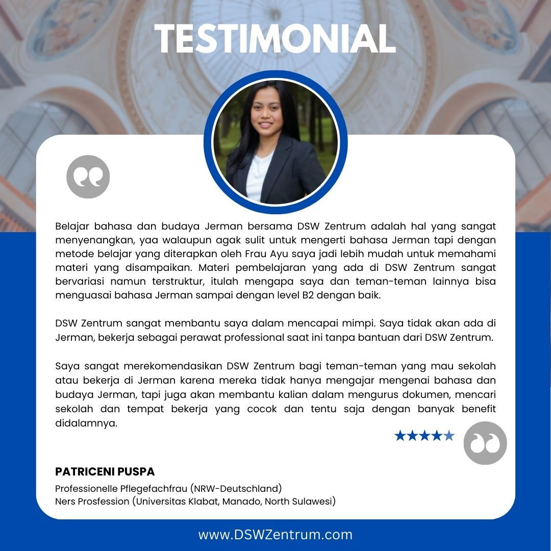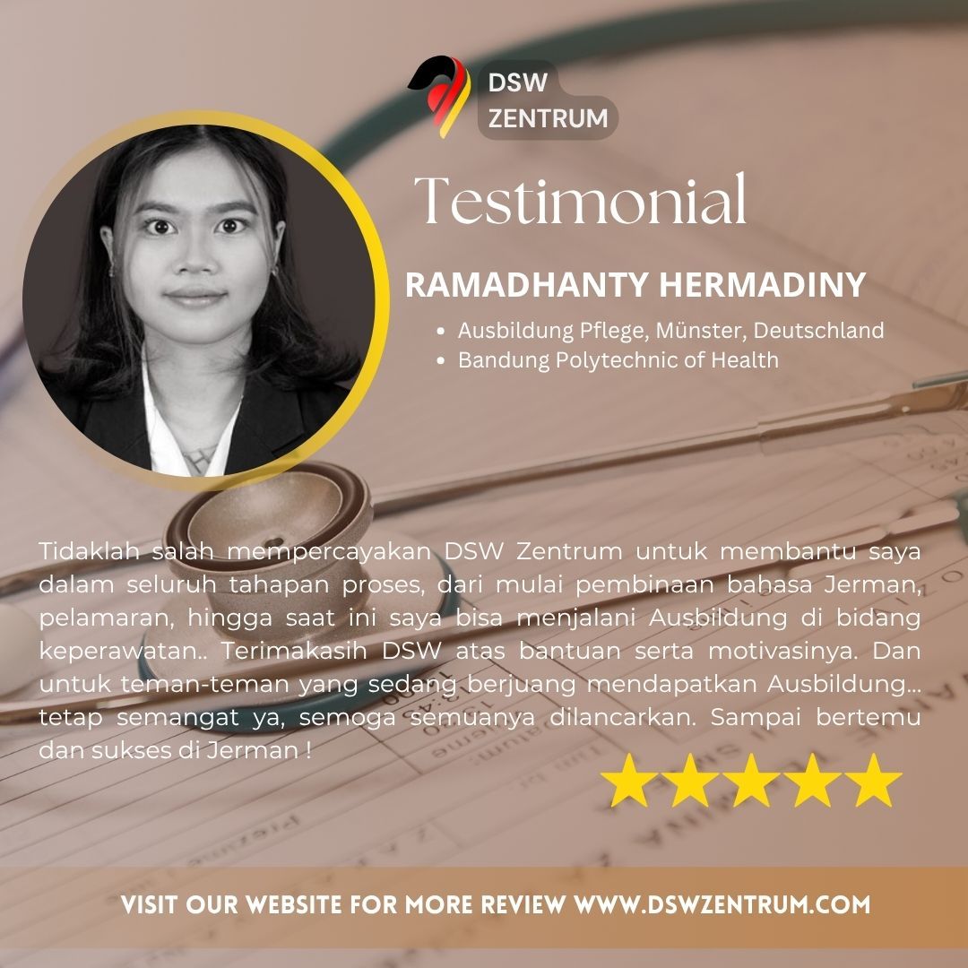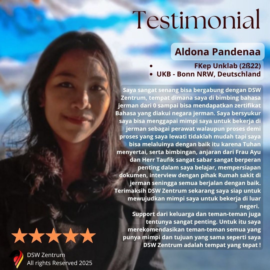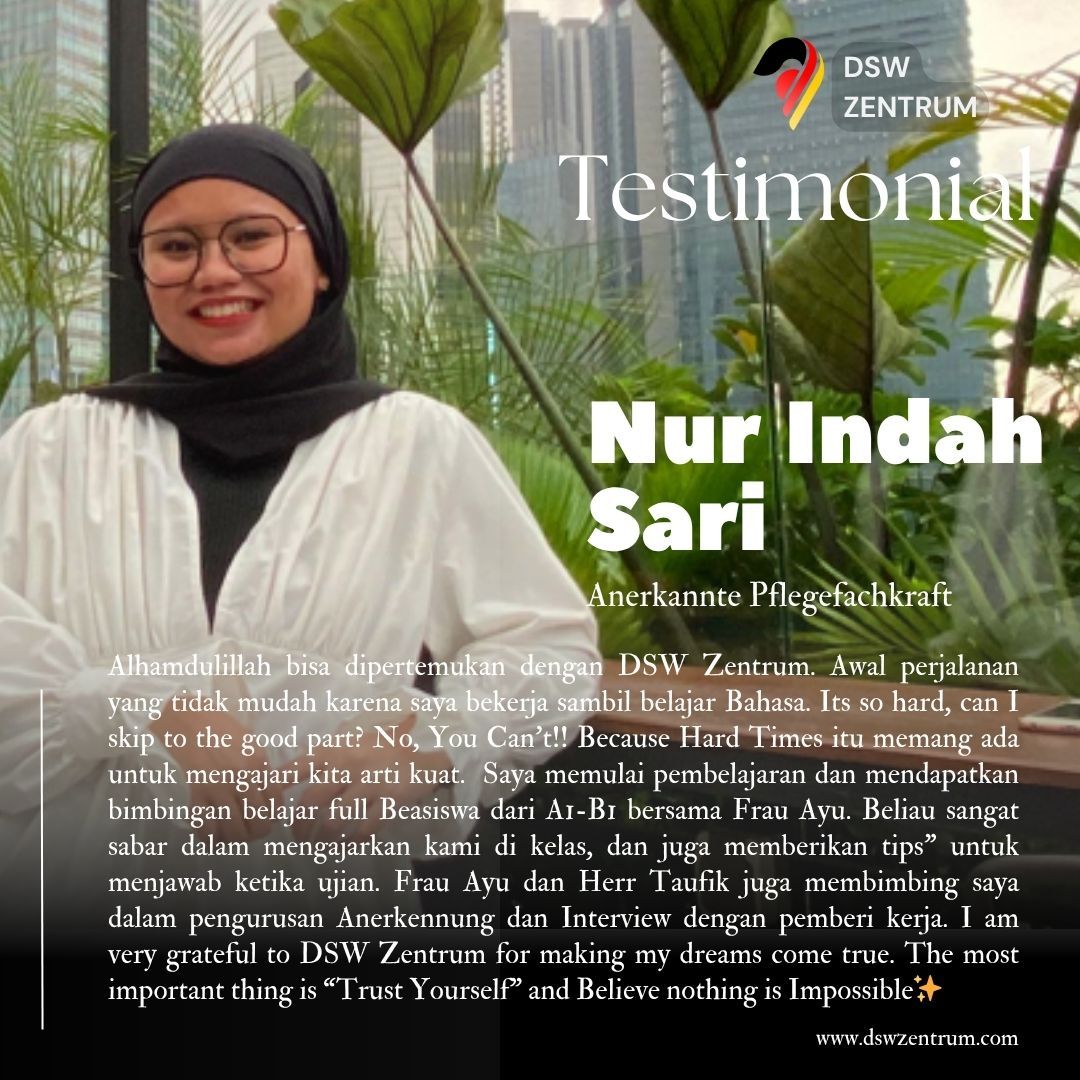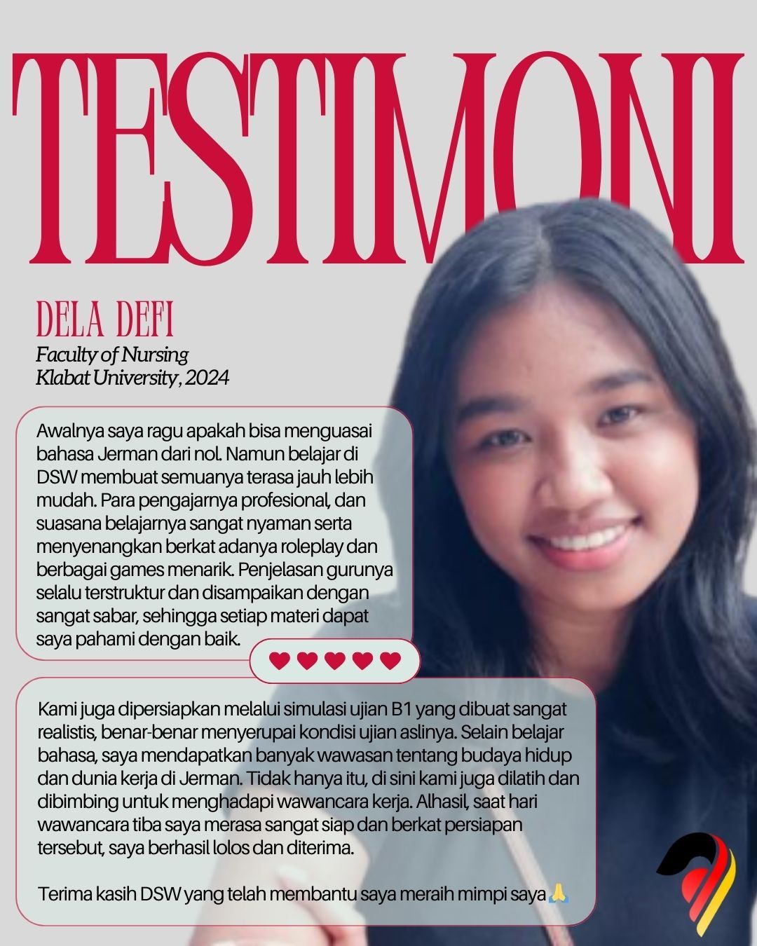 Berkat bimbingan dan motivasi dari para pengajar, saya merasa jauh lebih percaya diri dan siap untuk melangkah ke Jerman dan bekerja sebagai perawat. Terima kasih DSW Zentrum telah menjadi bagian penting dalam perjalanan saya!