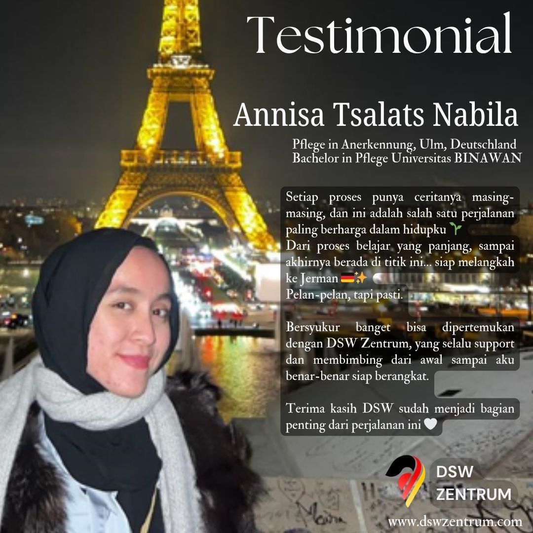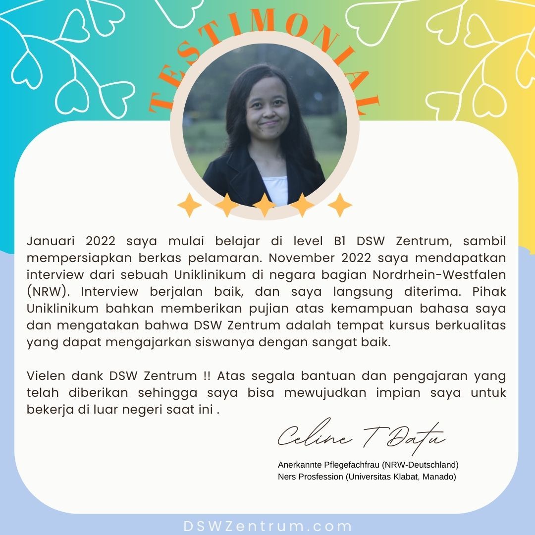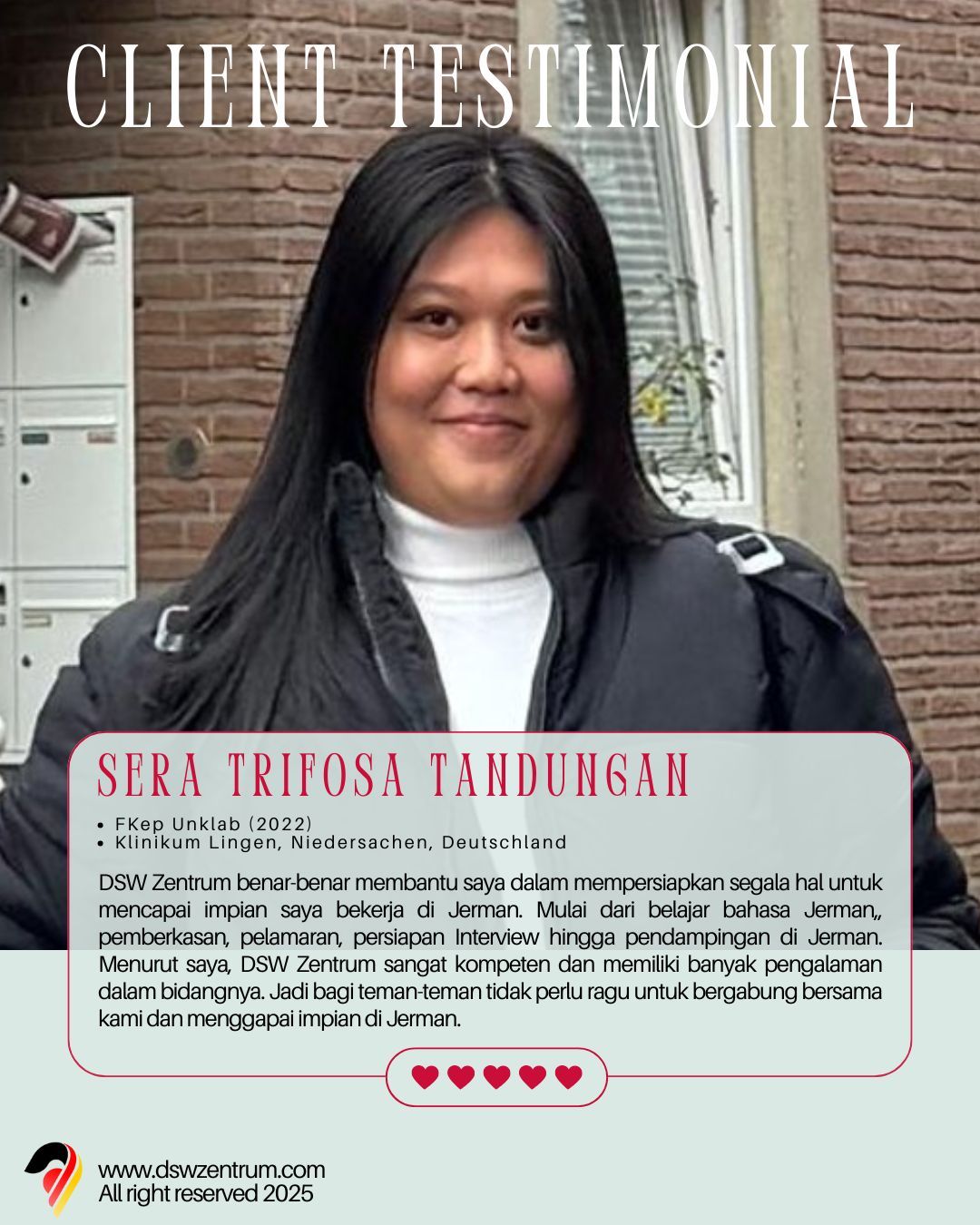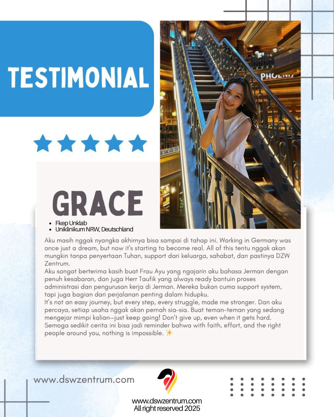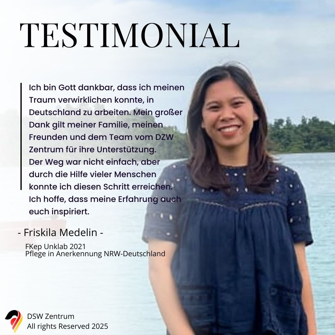 Berkat bimbingan dan motivasi dari para pengajar, saya merasa jauh lebih percaya diri dan siap untuk melangkah ke Jerman dan bekerja sebagai perawat. Terima kasih DSW Zentrum telah menjadi bagian penting dalam perjalanan saya!