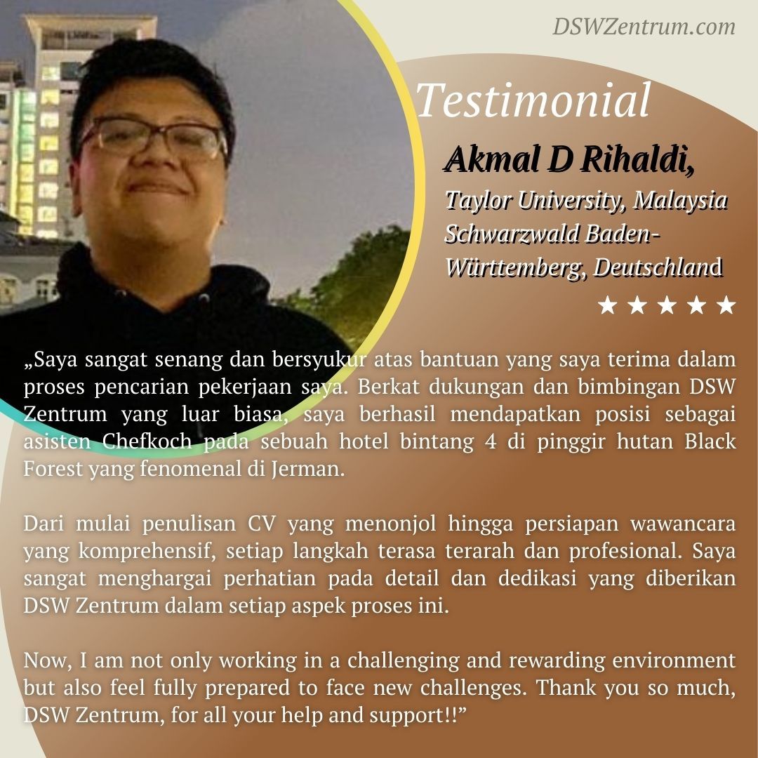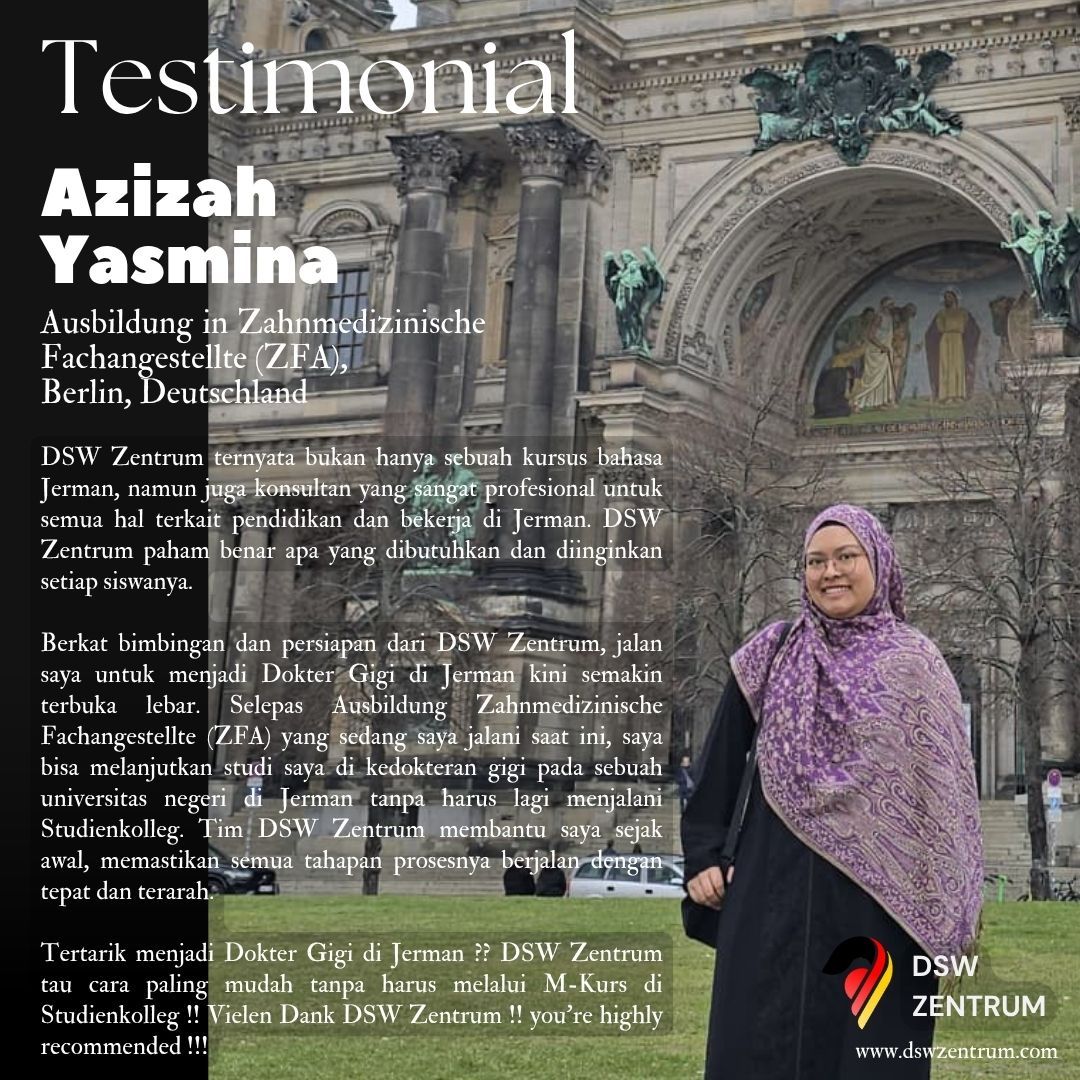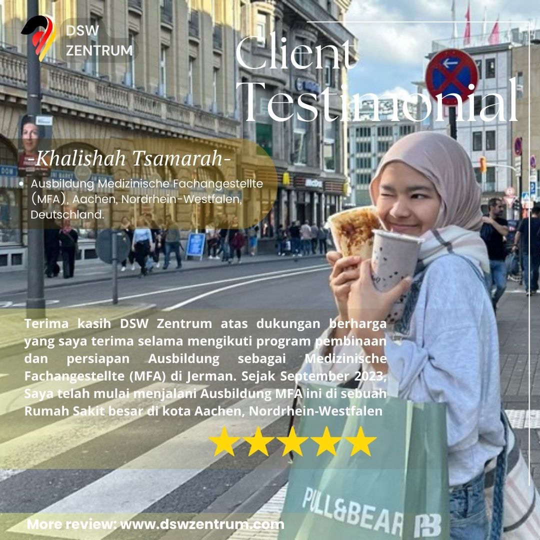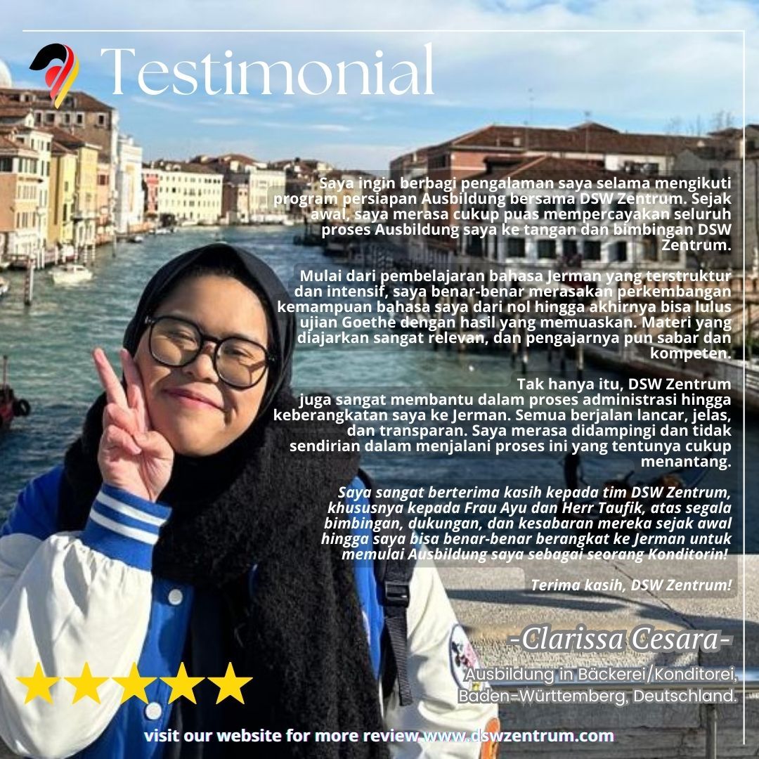 Pastinya DSW Zentrum ini sangat tepat untuk teman teman yang mau mempersiapkan diri untuk melanjutkan kuliah, Ausbildung, maupun kerja di Jerman. DSW Zentrum membantu kita dari mulai persiapan bahasa, dokumen, pelamaran, pengisian kontrak kerja, hingga visa. Sangat mempermudah bukan! Sekian testimoni ku Semangat untuk semuanya!!